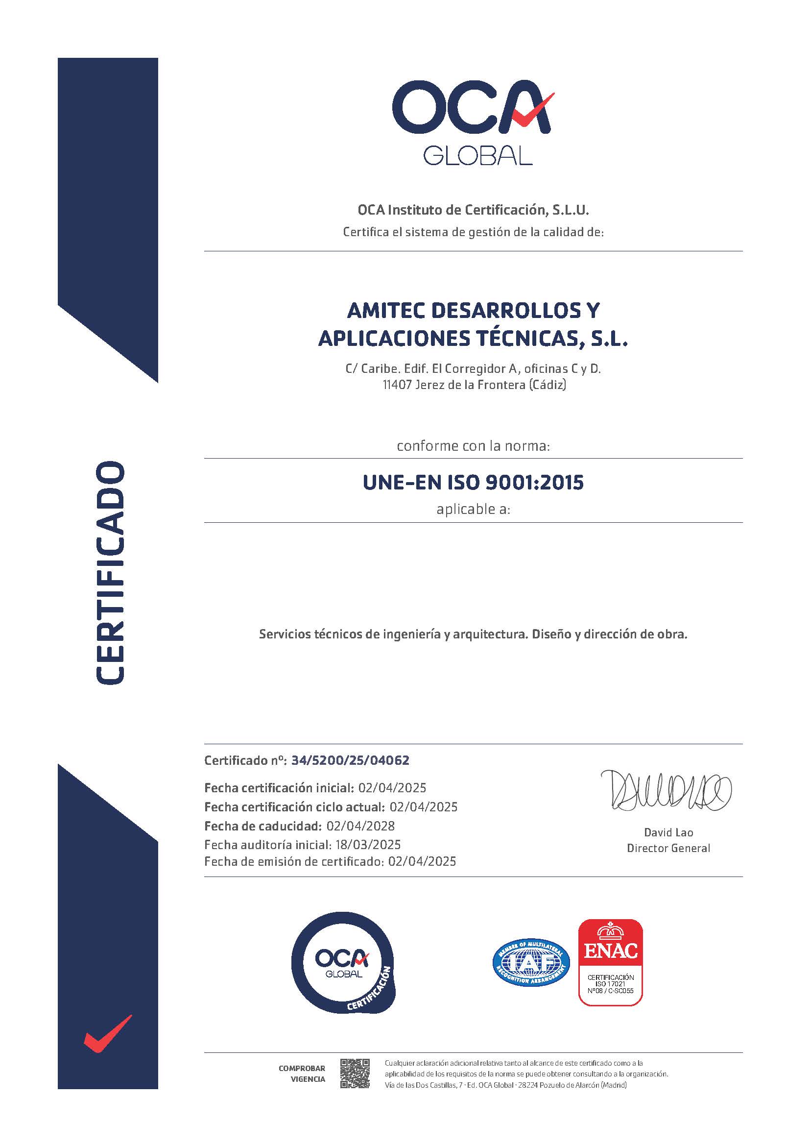 Certificación que avala que AMITEC cuenta con procesos estandarizados para garantizar la calidad de sus servicios de ingeniería y arquitectura, buscando la satisfacción del cliente y la mejora continua.