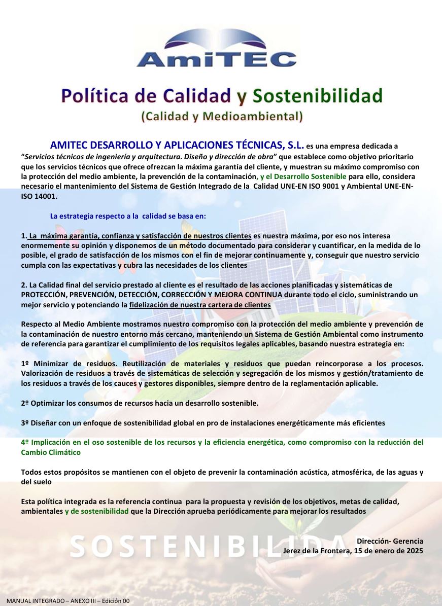 En AMITEC entendemos la calidad como la base fundamental de nuestra gestión. Nuestro objetivo es ofrecer servicios de ingeniería y arquitectura que satisfagan plenamente las necesidades y expectativas de nuestros clientes, cumpliendo con los requisitos legales y reglamentarios aplicables.